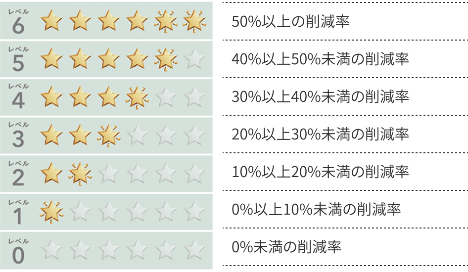 国が定める省エネ基準からどの程度消費エネルギーを削減できているかを見る指標 (BEI = Building Energy Index)を、星の数で示しています。